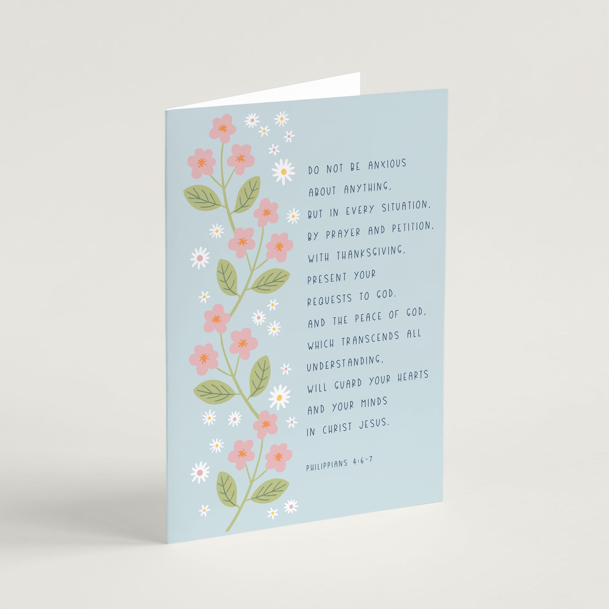 This A6 encouragement card reads 'Do not be anxious about anything, but in every situation, by prayer and petition, with thanksgiving, present your requests to God. And the peace of God which transcends all understanding, will guard your hearts and your minds in Jesus Christ. Phillippians 4:6-7'. This card is blank inside.