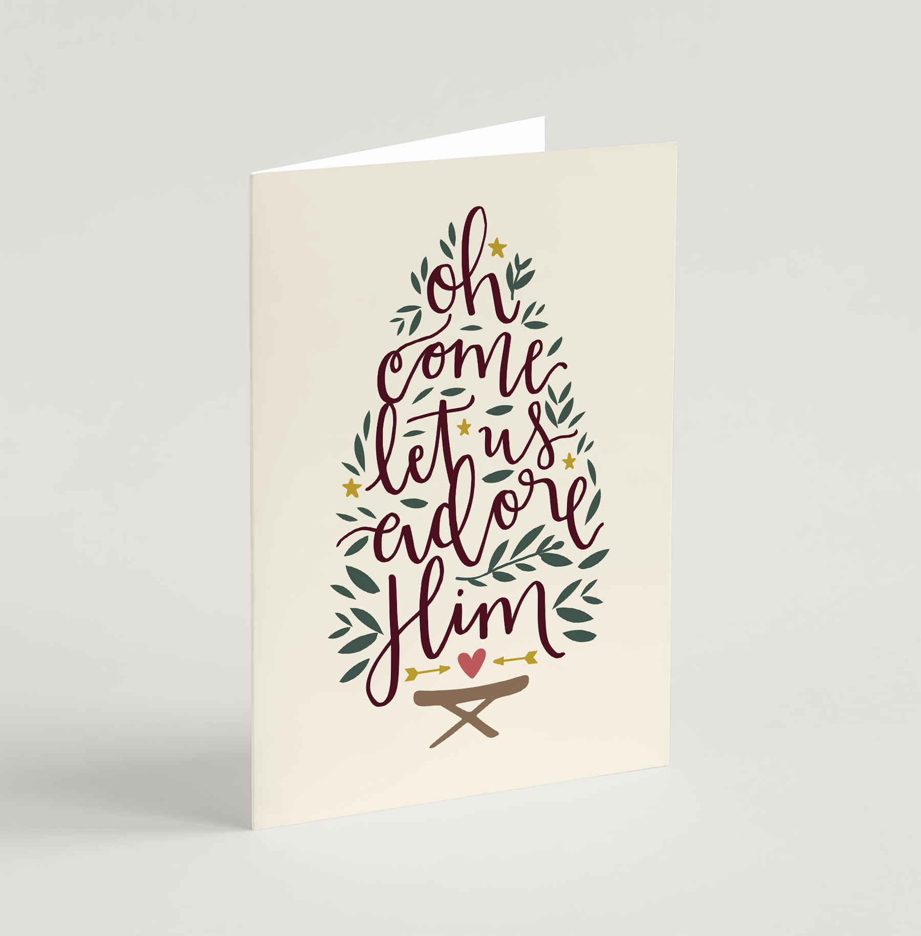 A contemporary Christmas Card featuring the popular carol: 'Oh Come Let Us Adore Him'.