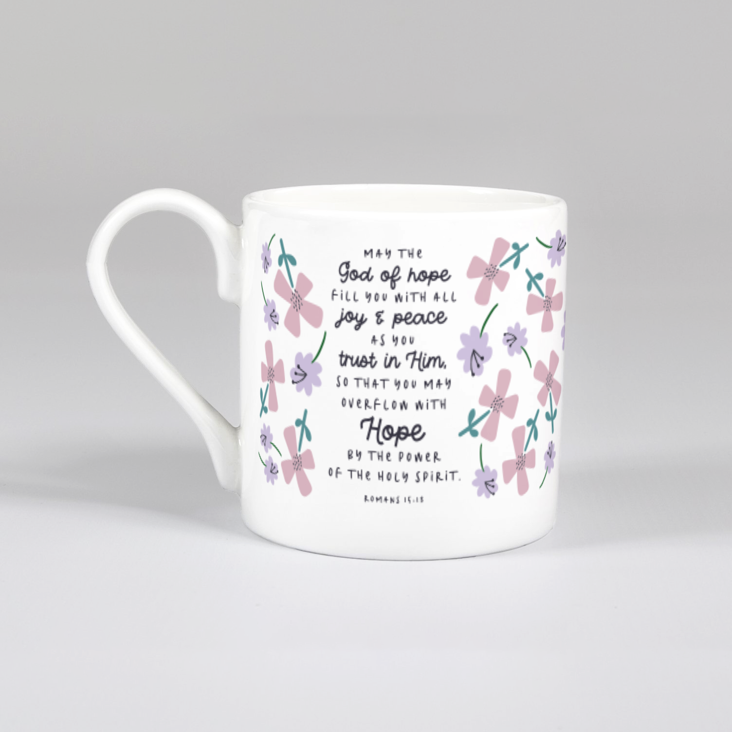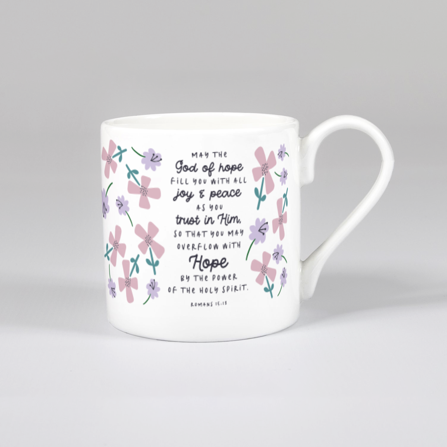 A contemporary style bone china mug printed with our beautifully illustrated Christian design featuring the verse 'May the God of hope fill you with joy and peace as you trust in Him' Romans 15:13.