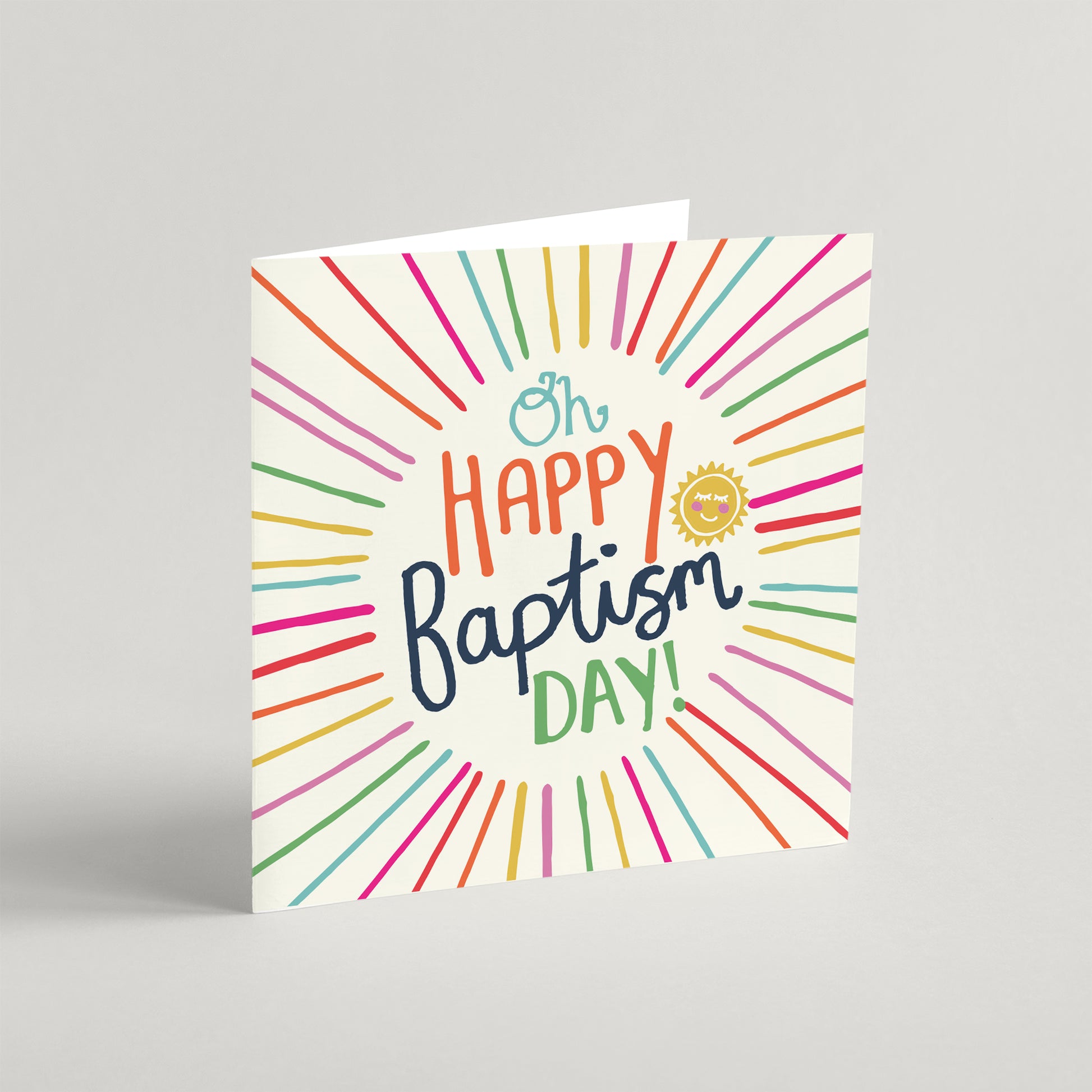 A bright, encouraging greeting card with the hand-lettered words 'Oh Happy Baptism Day'. This card is printed inside with the following verse: