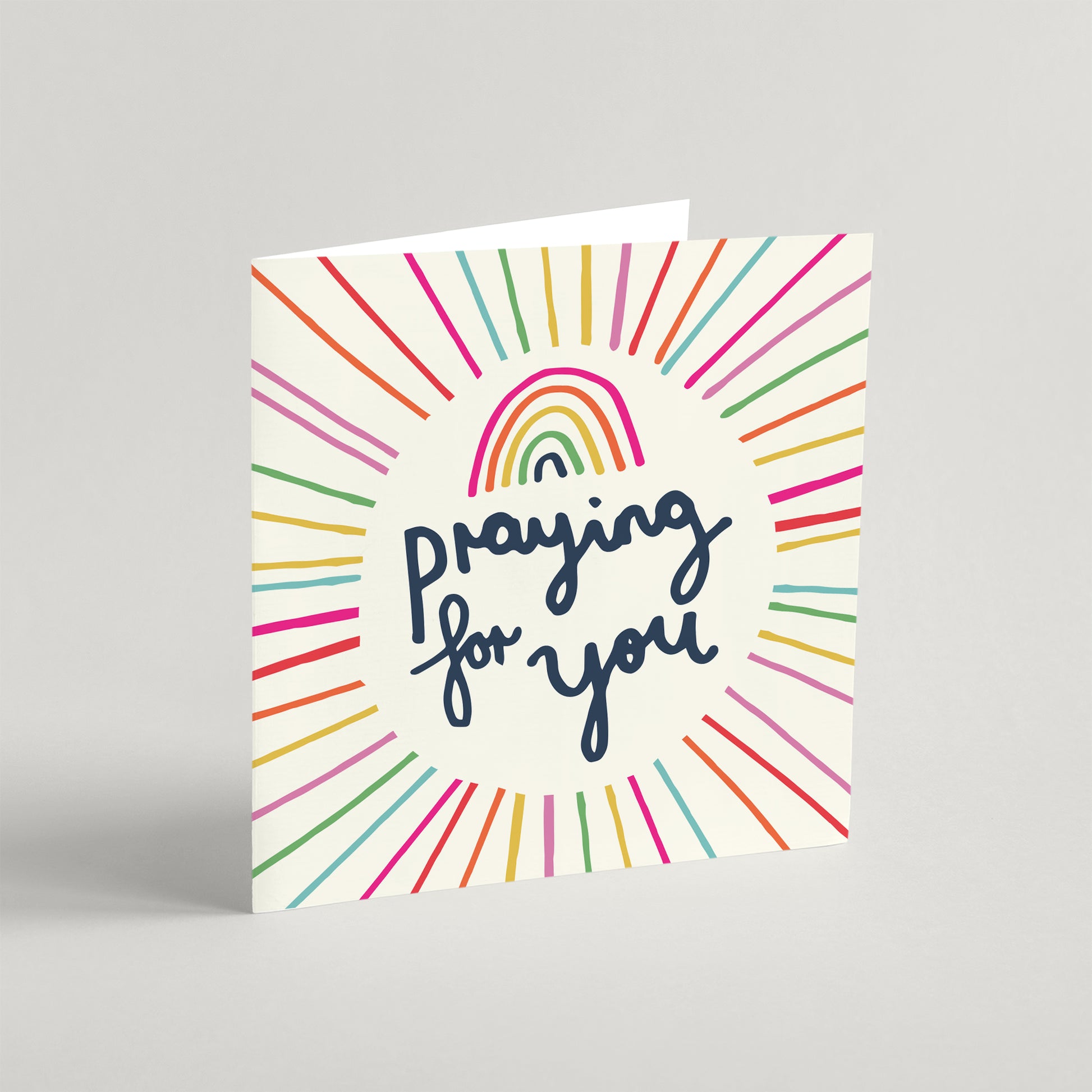 A bright, encouraging greeting card with the hand-lettered words 'Praying For You'. This card is printed inside with the following verse: