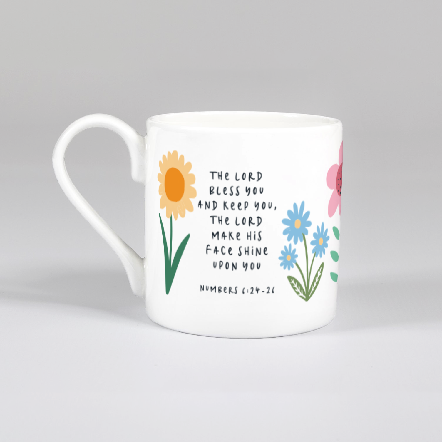 A contemporary style bone china mug printed with our beautifully illustrated Christian design featuring the verse 'The Lord bless you and keep you, the Lord make his face shine upon you' Numbers 6:24-26.