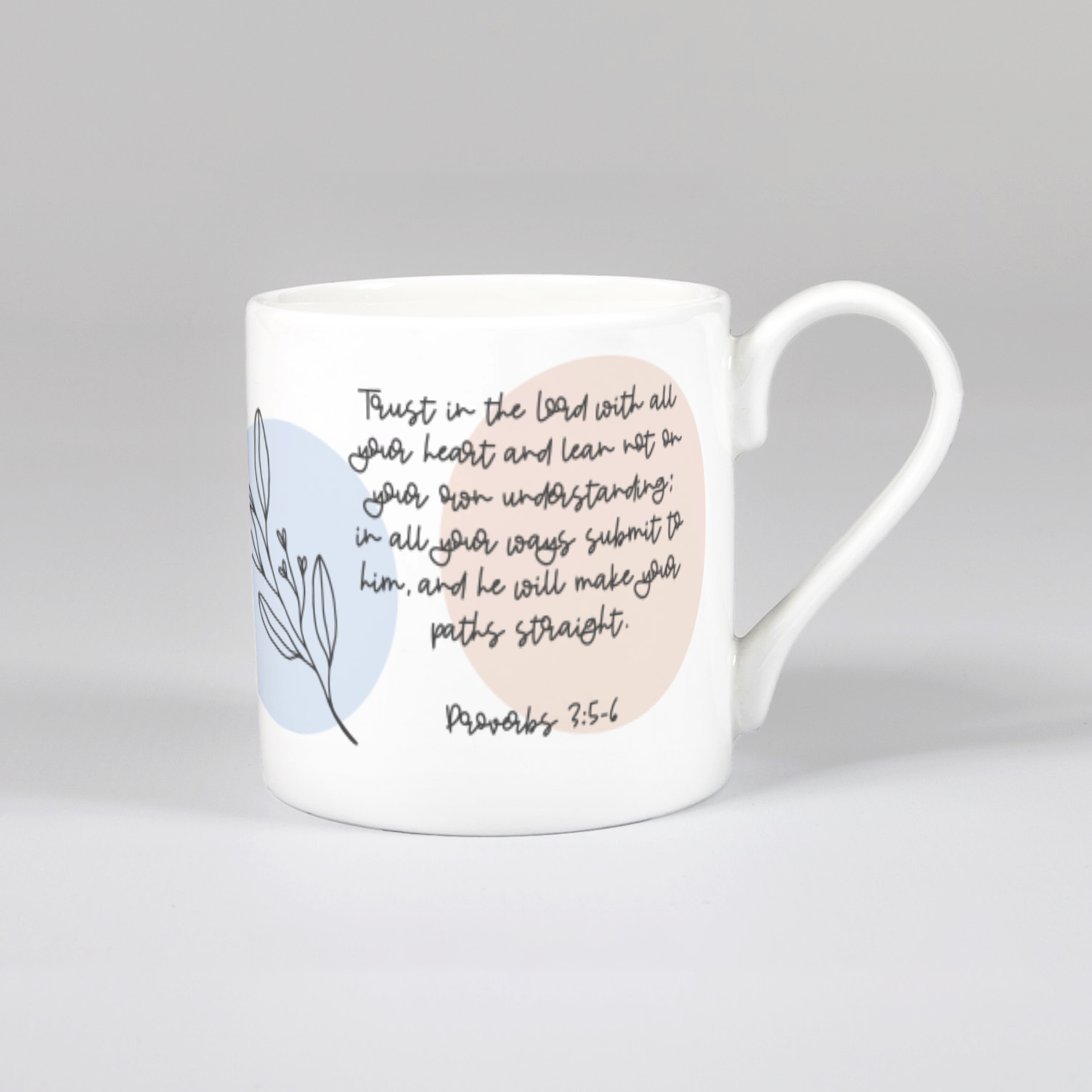 A contemporary style bone china mug printed with our beautifully illustrated Christian design featuring the verse 'Trust in the Lord with all your heart and lean not to your own understanding; in all your ways submit to him, and he will make your paths straight' Proverbs 3:5-6.