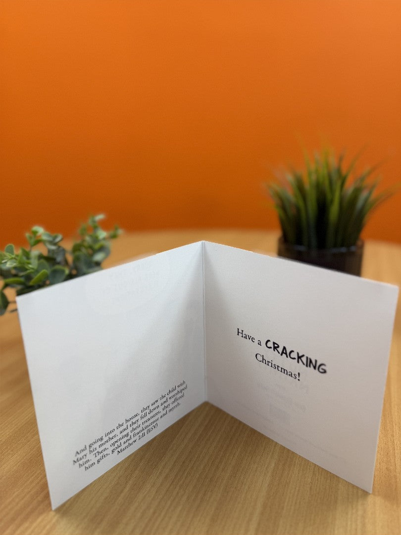 This card, featuring the wise men visiting Jesus, Mary and Joseph, has the greeting 'Have a CRACKING Christmas!' inside, along with the verse
