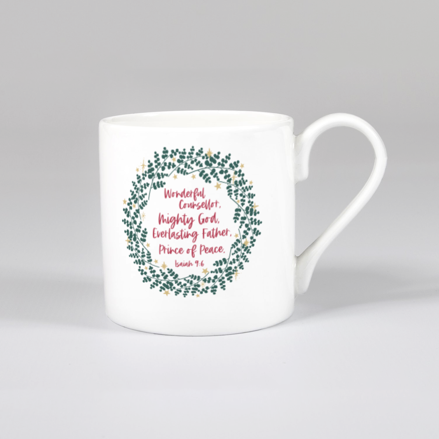 A contemporary style bone china mug printed with the verse 'Wonderful Counsellor' Isaiah 9:6 within a starry, leafy wreath. Perfect as a Christmas gift for any member of the family.